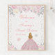 This elegant and glamourous winter sweet sixteen welcome sign features a beautiful princess with blonde hair and fair skin in a pink ball gown. The text combines handwritten script and modern sans serif fonts for a classy and sophisticated look. The floral arrangements, snowflakes and silver confetti create the perfect blend of rustic and chic.
