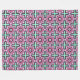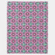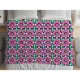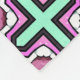 The image shows a towel set and washcloth with a vibrant geometric pattern featuring pink, blue, and black designs on a light background, conveying a lively and modern tone.