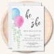 It features pink and blue watercolor balloons with eucalyptus and stylish script typography that says "he or she" in stylish script typography.