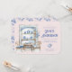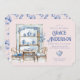 This tea party invitation has a chinoiserie design featuring a blue and white tea party with bamboo furniture on a pink background. The arched border has a blue floral branch pattern on a blush pink background. The front and back have a coordinating pattern.