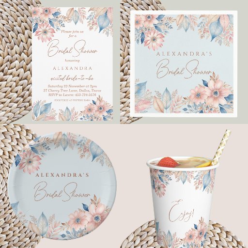 Personalise this perfect addition to your Boho Floral Bridal Shower: an exquisitely designed Invitation that will delight the excited bride-to-be. This beautiful invite features a design of dusty pink, beige, and blue flowers and leaves, artfully arranged against a crisp white background. The feminine and elegant design captures the essence of rustic and bohemian style, making it ideal for a Boho Chic Bridal Shower party, lunch or picnic. Each invitation exudes charm and sophistication, setting the tone for an unforgettable celebration filled with love and joy.