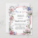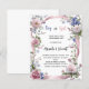An elegant white background, decorated witth pink and blue wildflowers and a pink ribbon. Personalise and add a name(s) and party details.