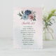Beautiful botanical wedding seating chart card featuring pink, dusty blue and navy blue flowers with green leaves.