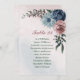 Beautiful botanical wedding seating chart card featuring pink, dusty blue and navy blue flowers with green leaves.