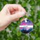 A keychain with a beautiful abstract design in pink and blue. White stars sprinkled throughout this image of the cosmos. Trippy and cool.