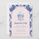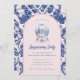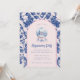 This Housewarming party invitation has a preppy grandmillennial design featuring a Gingerbread House in a snow globe with a blue and blush pink arched border around the edge. The front and back have a coordinating damask pattern.