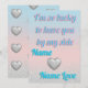 This elegant Valentine’s Day greeting card features a soft pastel pink and blue gradient background, accented with shimmering 3D-style silver glitter hearts. Designed for modern couples, the front displays a romantic "I’m so lucky to have you" message in stylish typography. This customisable stationery allows you to add recipient and sender names, making it a unique keepsake. The back contains a matching pattern of floating metallic hearts on a sparkling aesthetic backdrop. Perfect for boyfriends, girlfriends, or spouses who appreciate a contemporary "clean girl" or "soft boy" aesthetic. High-quality print-on-demand finish ensures vibrant colours and crisp details. Ideal for those searching for personalised romantic stationery with a metallic heart motif.