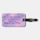 Painting of pink, blue, and purple spheres on a diagonal lavender background, with a placeholder for your contact info, is printed on custom luggage tags.
