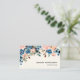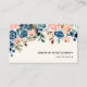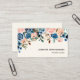 Business cards with a border of pretty painted pink and blue roses and green leaves. Set on a light yellow background.