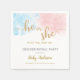This gender reveal party napkin features gold faux glitter calligraphy text "he or she" on a pink and blue watercolor background. Custom text allows you to personalise with your name and event name.