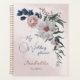 Beautiful botanical wedding planner featuring romantic pink, white and navy blue flowers with green leaves.