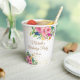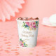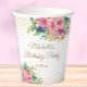 Elegant pink, blue, and yellow watercolor floral on white birthday party paper cups, personalised with the name of the guest of honour and her party date. Contact us for help with customisation or to request matching products.