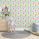 The design showcases a contemporary, summer-inspired daisy motif in shades of orange-yellow, lime green, pretty pink and bright blue set against a clean white background. It's an elegant and fashionable selection that embodies an enchanting, artistic, and abstract botanical quality, making it perfect for artistic interior designers, decor enthusiasts, trendsetters, and those who appreciate a blend of vintage retro charm and romantic sophistication. This stylish and feminine design is versatile for various modern home decor pieces, ideal for enhancing areas such as a master bedroom, guest room, child's room, or nursery with a unique flair.