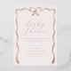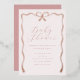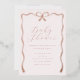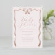 A beautiful and formal baby shower invitation featuring rose gold foil elements of a ribbon and bow. Perfect for a classic baby shower with a modern and trendy twist. Blush gold foil details create a pretty ribbon border with a vintage style.