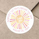 This round sticker design features a vibrant sun at the centre, with the cheerful phrase "Thank You!" placed right on top of the sun. The sun's rays burst out in shades of yellow, orange, pink, and red, bringing warmth and joy to your celebration.
