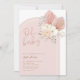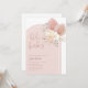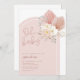 Celebrate the mum-to-be with this modern and elegant floral arch baby shower invitation featuring a soft pink arch covered with a floral bouquet made of white and blush pink flowers, dried greenery and pink palm leaves.