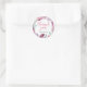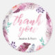 Thank you stickers with personalised details for your wedding favours, features pink and purple watercolor feathers and florals.