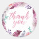 Pink boho feather thank you stickers for your wedding favours, baby shower favours or bridal shower favours, features blue and purple watercolor feathers and florals.