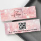 Mini earring display card with centred custom logo template and QR code on a light pink background with soft bokeh glitter lights. The earring guides can be adjusted by adding and removing spaces in the template field, and by moving the whole element in the design tool.