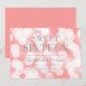 Chic 16th birthday party invitation featuring the words "Sweet Sixteen" in faux silver foil against a pink champagne bokeh lights pattern background. Invitation has a pink background back side.