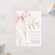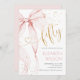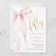Pink Bow 50th birthday invitation. Modern feminine design in blush pink and gold. Features trendy watercolor coquette bow, and heart script font "fifty". Perfect for an elegant style women's bday celebration. Personalize with your own details. Printed Zazzle invitations or instant download digital printable template.