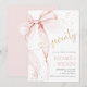 Pink Bow 70th birthday invitation. Modern feminine design in blush pink and gold. Features trendy watercolor coquette bow, and heart script font "seventy". Perfect for an elegant style women's bday celebration. Personalize with your own details. Printed Zazzle invitations or instant download digital printable template.