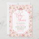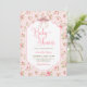 Pink Bow Baby Shower Invitation. Shabby chic girl baby shower invite. Dainty soft blush pink bow ribbon with delicate feminine watercolor roses background. Sweet as the mother to be. Calligraphy script lettering.