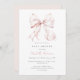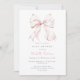 Minimal baby shower invitation that features an elegant pink bow and pink background.