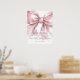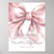 Pink Bow Baby Shower Welcome Sign. This elegant sign showcases an oversized pink watercolor bow spanning the top, creating a bold and charming focal point. Grey fonts in a mix of script and serif typography add a sophisticated touch.