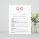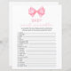 This baby shower word scramble game is perfect for a baby shower or baby sprinkle. This word scramble game features a pink watercolor coquette bow on the front and back. You can personalise this design by clicking on "Personalise this template" or if you wish to change the font, colours or arrange the design elements in a different way you can click on "Edit using Design Tool". Answer Key: 1. Diaper 2. Bassinet 3. Bottle 4. Crib 5. Pacifier 6. Changing Table 7. Stuffed Animal 8. Stroller 9. Rubber Ducky 10. Blanket 11. Teether 12. Formula 13. High Chair 14. Mobile 15. Thermometer 16. Baby 17. Milk 18. Booties 19. One-sie 20. Teddy Bear