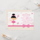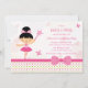 This cute 5x7 girls birthday party invitation has a sweet ballerina theme. On the bottom and back, there is a hot pink, green, and white polka dots design. There is a pink puffy bow and ribbon with a faded hearts design at the top. On the left, there is a cute black hair little ballerina dancing while holding a star wand. There is two butterflies flying around with your easily customisable party information on the right. Some design elements by STOCKBERRY STUDIO