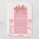 A pink and white birthday invitation featuring a festive bow, polka dots, and zebra stripes while the text is framed with a faux glitter border.