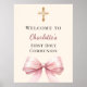 A large pink bow and a golden cross as decoration. A soft ivory blush colored background. Personalize and add her name.