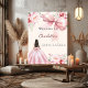 A cream, beige coloured background decorated with a large pink bow and pink roses, florals. A girl wearing a pink dress. Personalise and add a name.