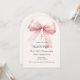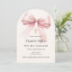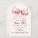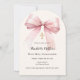 A soft beige, cream coloured background, decorated with a pink large bow and a golden cross. Personalise and add a name and details details.