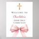 A large pink bow and a golden cross as decoration. Personalize and add her name.