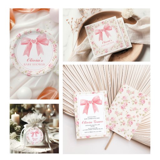 Pink bow and rose floral pattern preppy baby Shower Bingo game card.