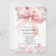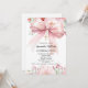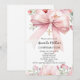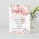 A white background, decorated with a pink large bow and, a golden cross and pink flowers. Personalise and add a name and details details.