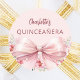 A soft blush pink coloured background. Decorated with a large pink bow and pink flowers. Personalise and add a name. Black handwritten style script.