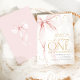Pink bow girl's 1st birthday invitation. Modern feminine design in blush pink and gold. Features trendy watercolor coquette bow, calligraphy heart script font and modern typography ONE. Perfect for an elegant style girl's first bday celebration. Personalize with your own details. Printed Zazzle invitations or instant download digital printable template.