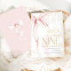 Pink bow girl's 9th birthday invitation. Modern feminine design in blush pink and gold. Features trendy watercolor coquette bow, calligraphy heart script font and modern typography NINE. Perfect for an elegant style girl's fifth bday celebration. Personalize with your own details. Printed Zazzle invitations or instant download digital printable template.