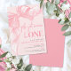Girls Just Wanna Be ONE 1st Birthday Invitation. This adorable design features a soft blush pink background on the front, creating a sweet and girly base for the celebration. A playful watercolor bow with a ribbon frame accents the top and left side, adding a charming and stylish touch. The phrase “Girls Just Wanna Be ONE” is displayed at the top in a mix of fun script and classic serif fonts, setting the tone for a cute and modern first birthday party.