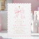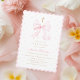 Coquette baptism invitation that features an elegant pink bow and a gold cross and white pearls