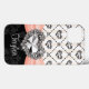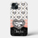 Personalise this beautiful pink and black damask FAUX PRINTED rhinestone heart and diamond look design with a pink satin bow and repeating solitaire diamond and heart patterned design. Your name can be added to the bottom of the case that is black with a subtle grey damask background. No three dimensional embellishments have been added. Image will be printed flat as shown in the product view. Artwork and design © Chrissy H. Studios, LLC. All Rights Reserved.