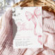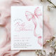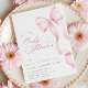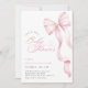 Pink Bow Ribbon Baby Shower Invitation. This elegant invitation features a charming blush pink bow and romantic handwritten script, perfect for a whimsical baby girl shower. The chic ribbon and preppy design add a touch of sophistication, while the editable template allows for easy customisation. Create a beautiful and memorable invitation for your special event.