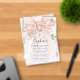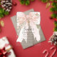 Blush pink watercolor coquette bow is decorated with roses and sage green greenery. A gold cross is placed above the text. The back is a chic pink and white stripe pattern. Your daughter's name is written in a beautiful calligraphy script. All text is editable.