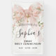 Blush pink watercolor coquette bow is decorated with roses and sage green greenery. A gold cross is placed above the text.