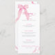 The AMORETTE pink bow menu design features a simple, classic design with a white background and a watercolor pink bow with ribbons, paired with a handwritten script font and elegant serif fonts in matching shades of pink and grey. This pink bow menu template pairs perfectly with a feminine pink bow themed bridal shower.