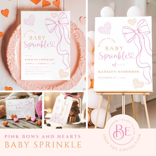 Celebrate your little one’s arrival with this elegant Pink Bow Baby Sprinkle Invitation. Featuring a hand-drawn bow illustration, playful sprinkled hearts, and modern typography in blush pink and tangerine tones, this design perfectly combines sweetness and sophistication. Ideal for a minimalist yet stylish baby shower celebration.