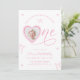 A sweet and elegant first birthday invitation featuring a delicate pink bow theme and a charming heart photo frame.